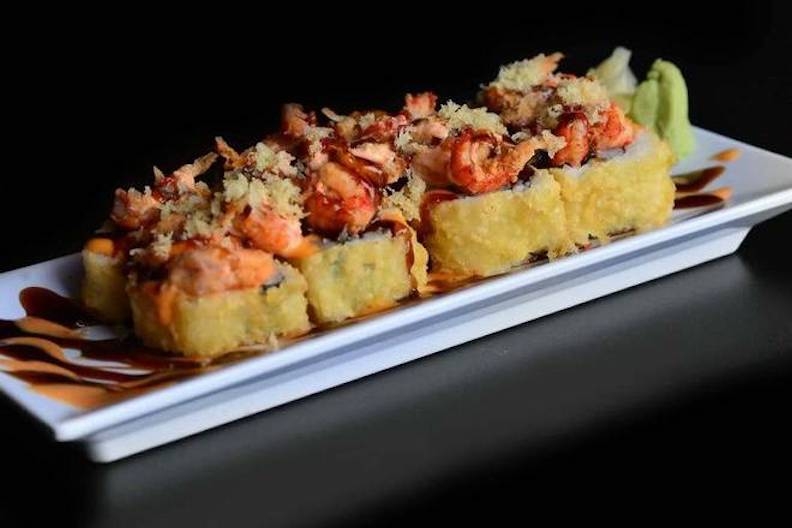 Lobster and cucumber inside, topped with layered avocado, tobiko, crunchy flakes, sesame seeds and a ginger dressing sauce