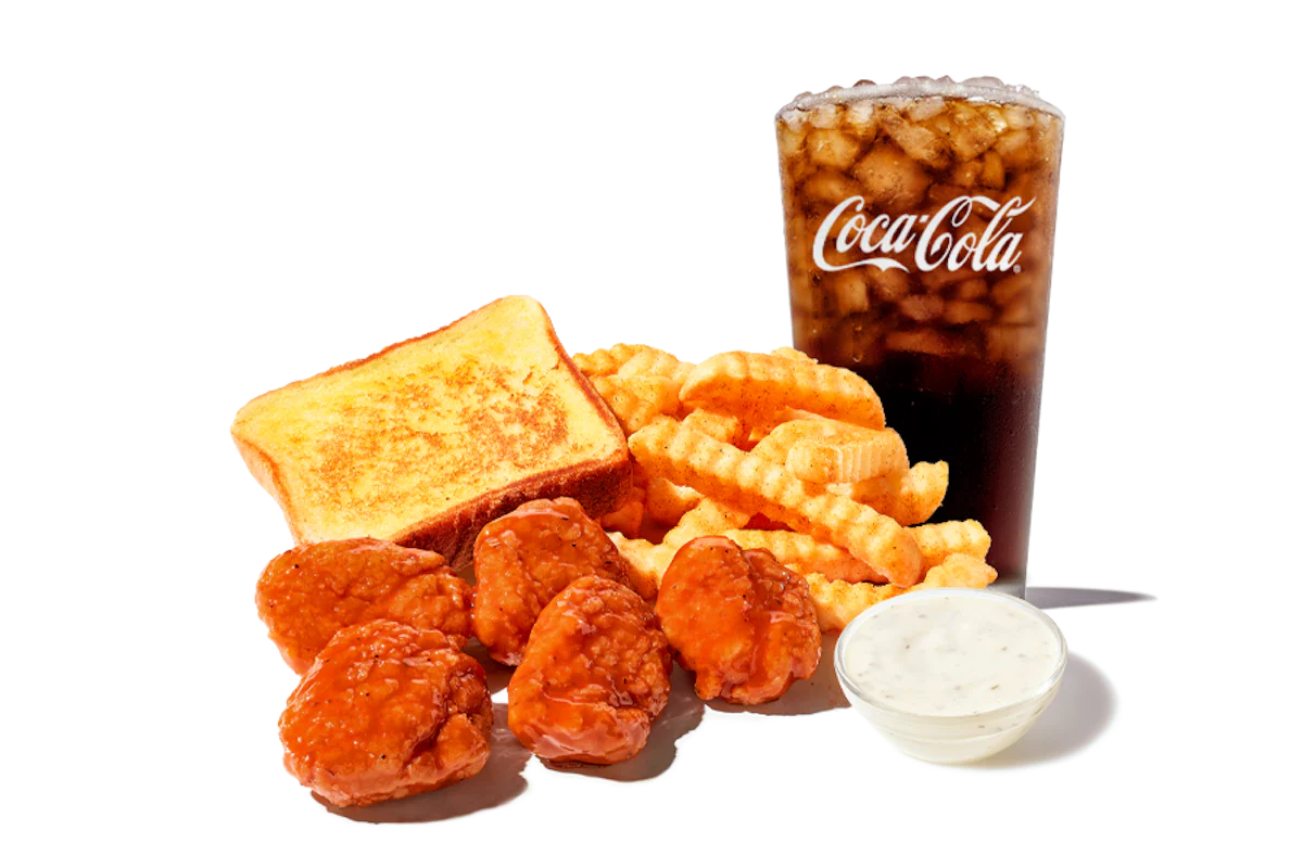 5 Boneless Wings made from all-white breast meat tossed in your choice of sauce. Served with Ranch, Texas Toast, Crinkle Fries, and Small Drink.