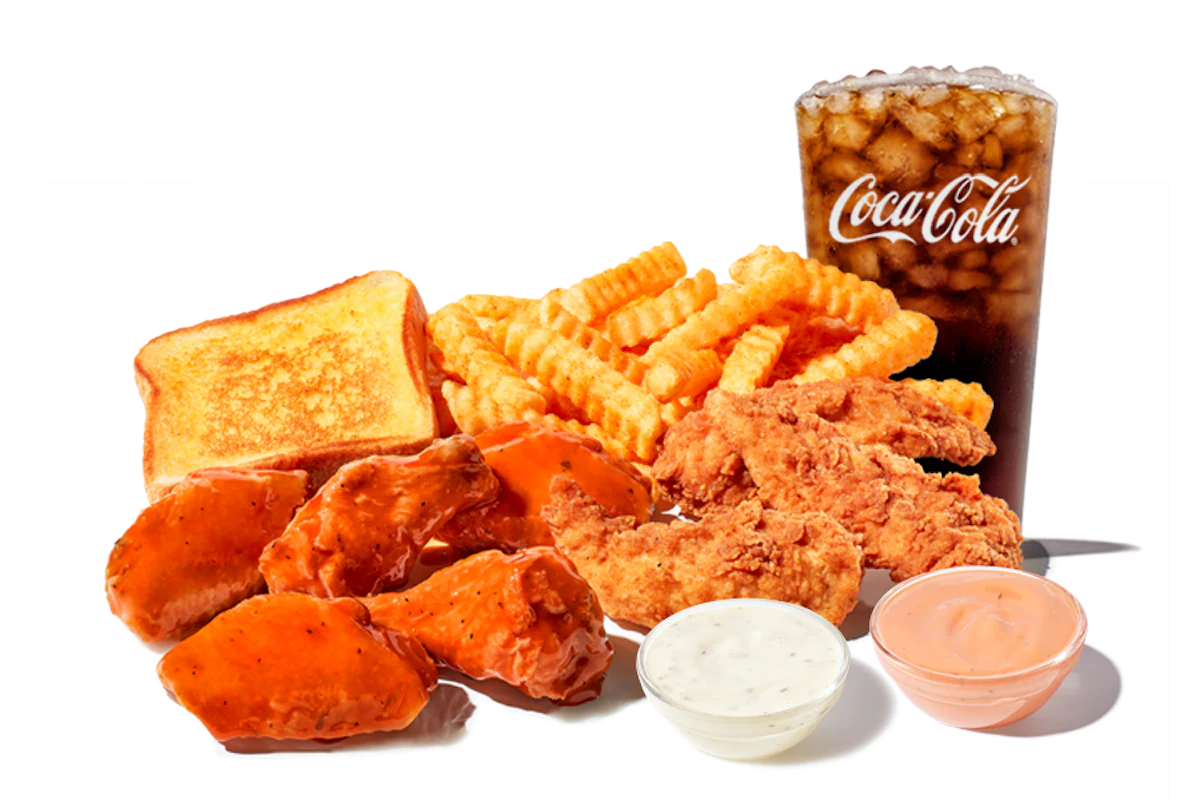 5 Boneless Wings made from all-white breast meat or 5 Traditional Wings tossed in your choice of sauce with Ranch, plus 3 Chicken Fingerz™ with Zax Sauce®. Served with Texas Toast, Crinkle Fries, and Small Drink.