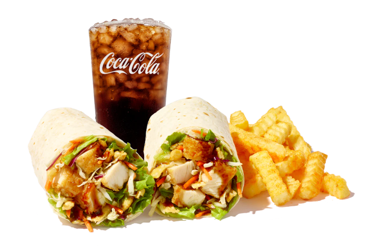 A Giant Chicken Finger Wrap with 3 hand-breaded Chicken Fingerz™, mixed greens with carrots and red cabbage, wonton strips, Asian Slaw, and a drizzle of Teriyaki Sauce wrapped in a flour tortilla. Served with Crinkle Fries and Small Drink. Also available with Grilled Chicken.